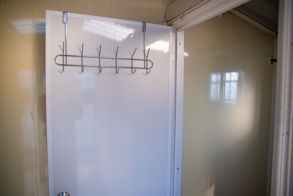 淋浴間只有簡單的蓮蓬頭及門上的掛勾